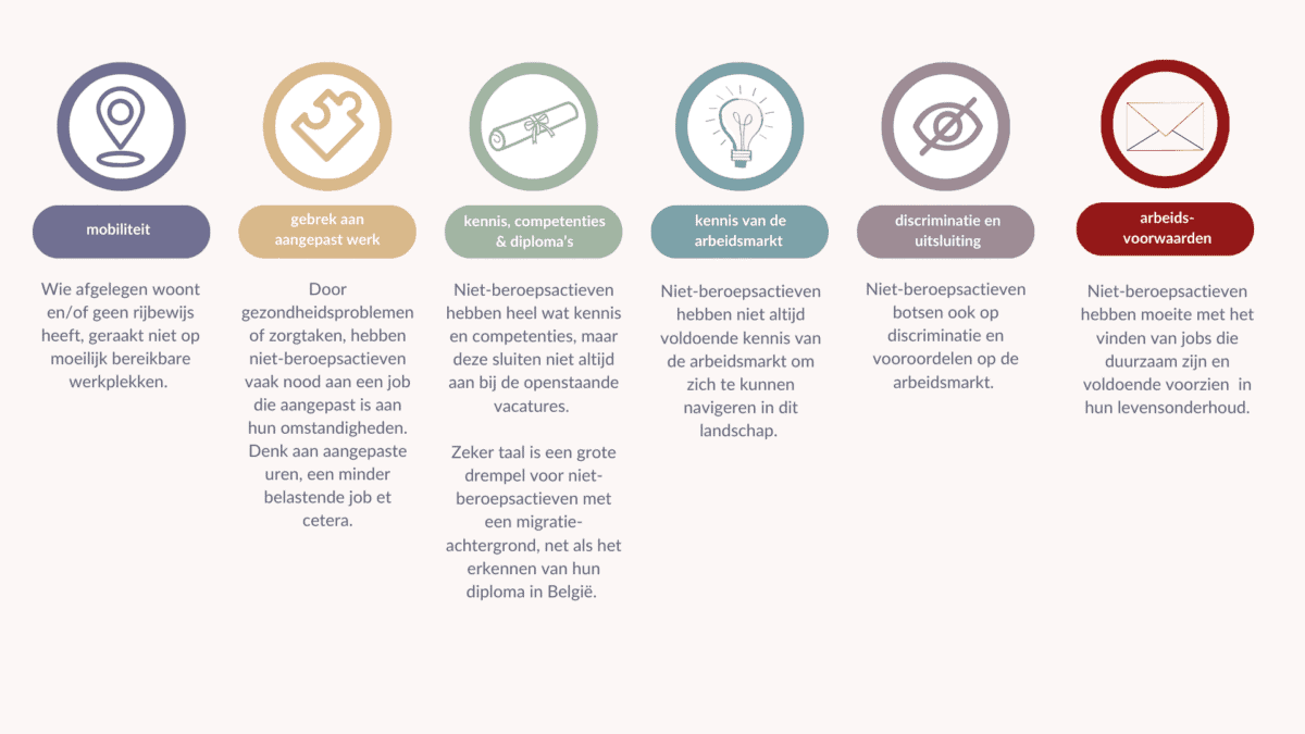 Niet-beroepsactieve personen ondervinden vaak één of meerdere drempels die hun toegang tot de arbeidsmarkt bemoeilijken. Om een niet-beroepsactieve persoon richting werk te begeleiden, is het belangrijk dat je voldoende de tijd neemt om hun levenssituatie en de eventuele drempels die ze ervaren te kennen. Zonder deze drempels voldoende te begrijpen, zal je moeilijk kunnen inschatten hoe deze een impact hebben op hun traject richting werk.